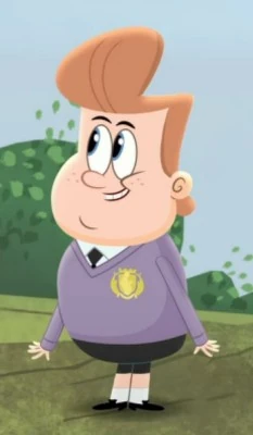 Gil has ginger hair shaped in a small toupee similar to his dad, a purple sweater with a yellow badge, a white undershirt, a black tie, black shorts, and black shoes with long white socks.